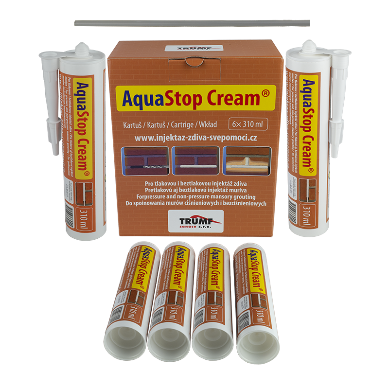 AquaStop Cream® ist eine Silancreme auf rein wässriger Basis zur Sanierung von feuchtem Mauerwerk und Fundamenten. Nach dem Eindringen in das Mauerwerk reagieren die Wirkstoffe mit der umgebenden feuchten Umgebung und es entsteht direkt im Mauerwerk ein hydrophobes polymeres Silikonharz, das weder wasser- noch dispergierlöslich ist und Wasser abstößt. Es bildet eine dauerhafte Barriere, die das Eindringen von Feuchtigkeit in flüssiger Form verhindert und den Wassertransport in den Kapillaren unterbricht. Das Mauerwerk behält seine ursprünglichen physikalisch-mechanischen Parameter bei. Das Produkt enthält keine organischen Lösungsmittel und kann mit einer Injektionspumpe oder Applikationspistole aufgetragen werden (bei Tubenverpackung ohne Gerät).